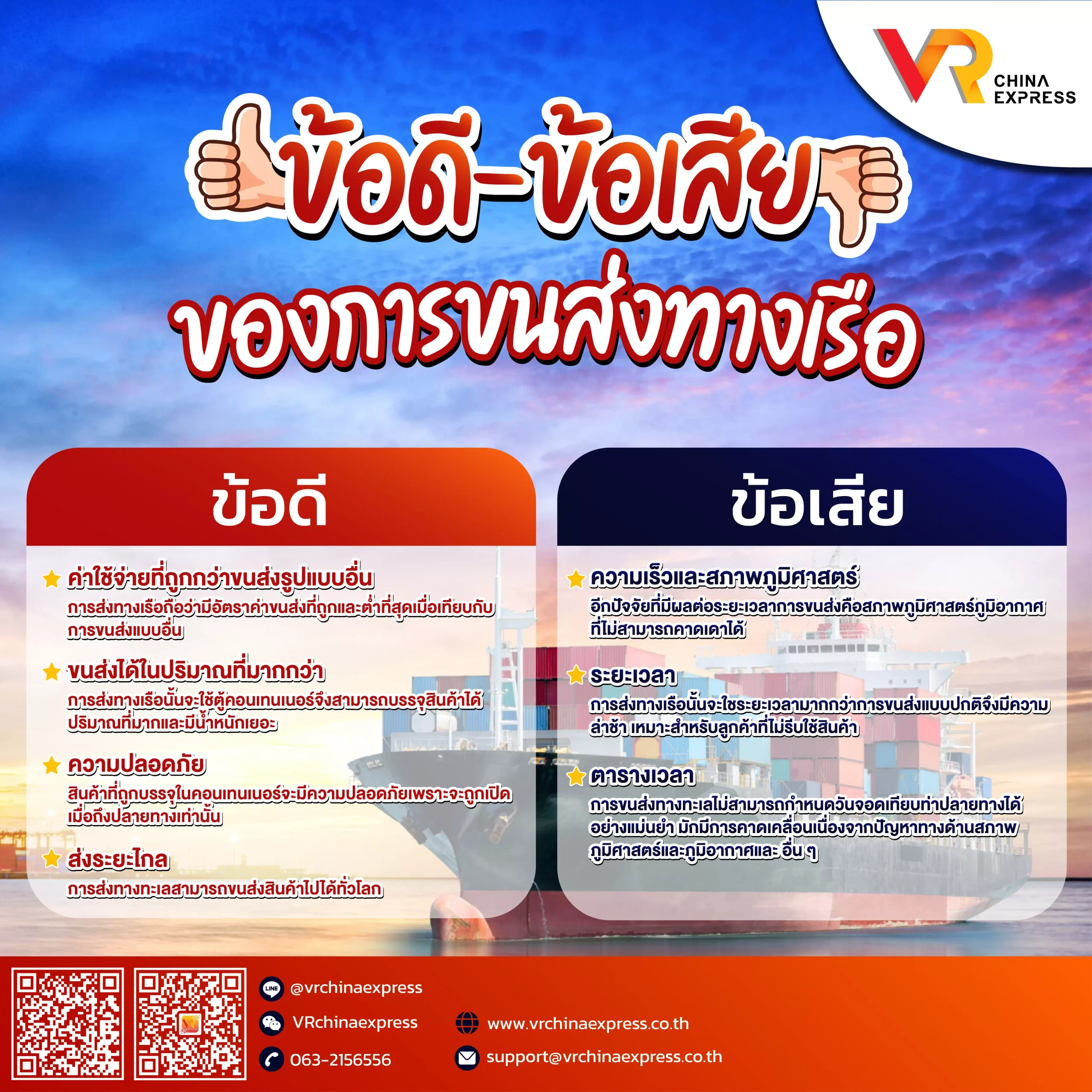 -ระยะเวลา การส่งทางเรือนั้นจะใชระยะเวลามากกว่าการขนส่งแบบปกติจึงมีความล่าช้า เหมาะสำหรับลูกค้าที่ไม่รีบใช้สินค้า